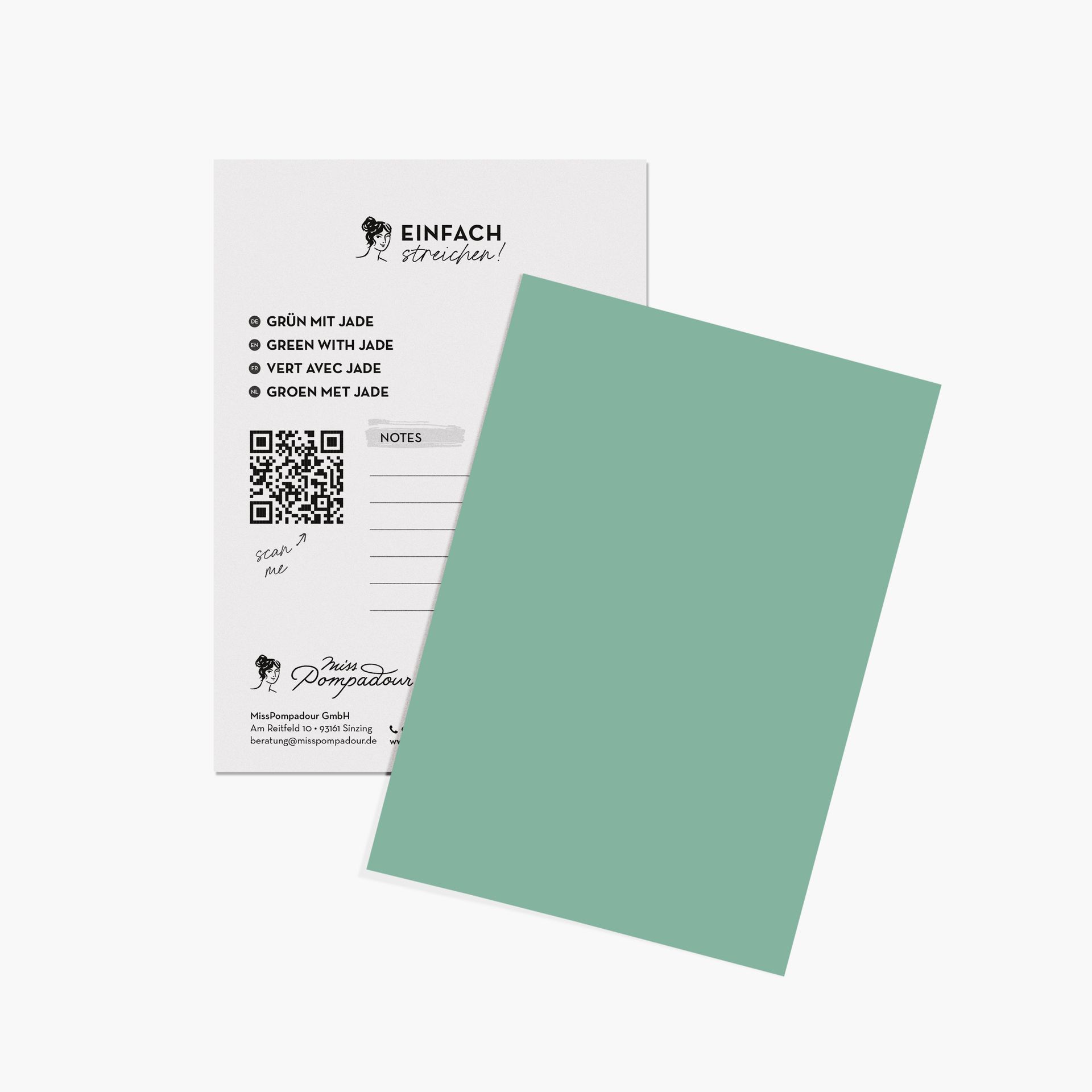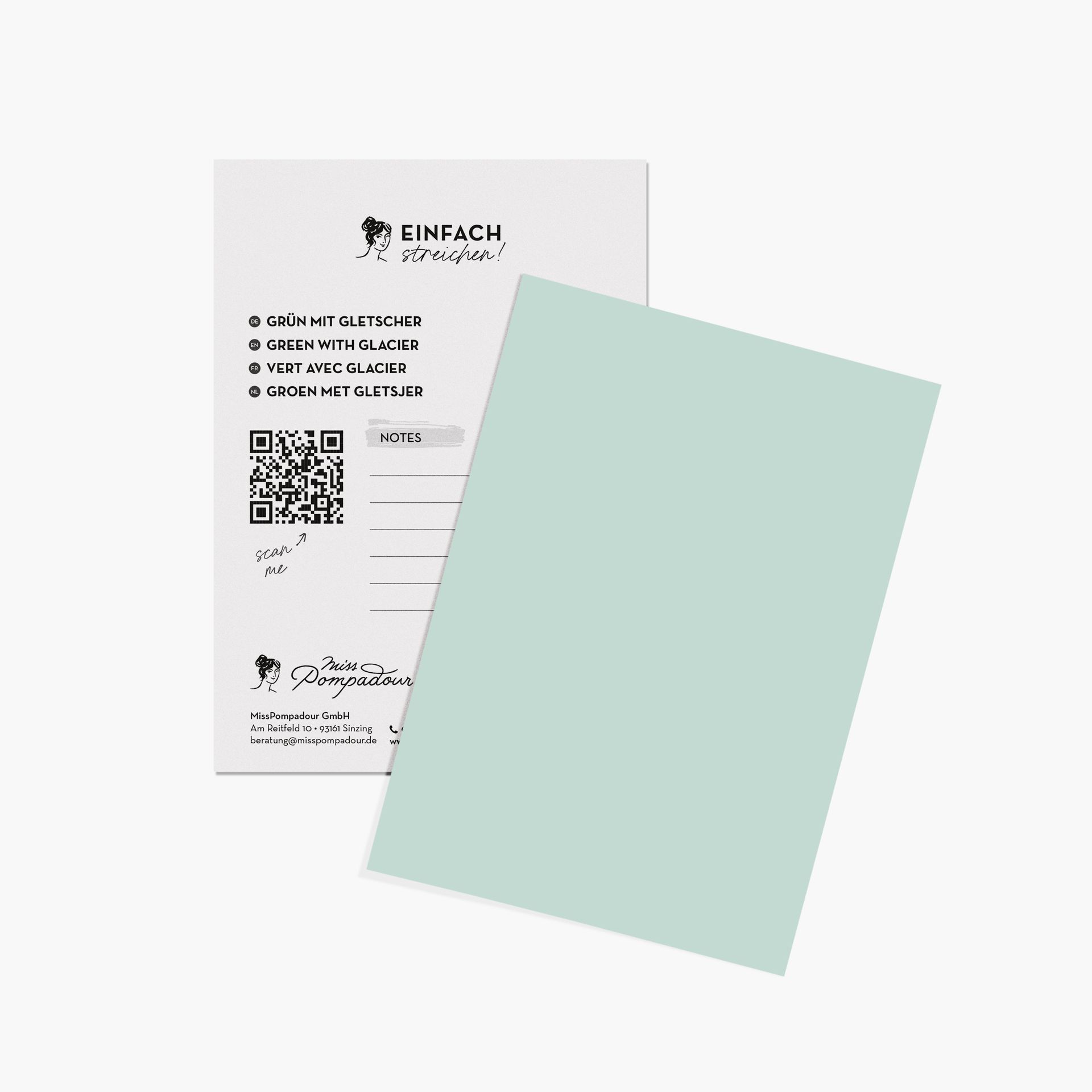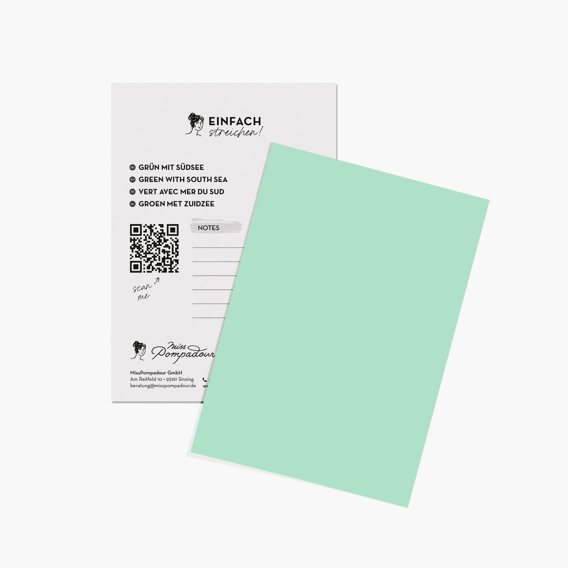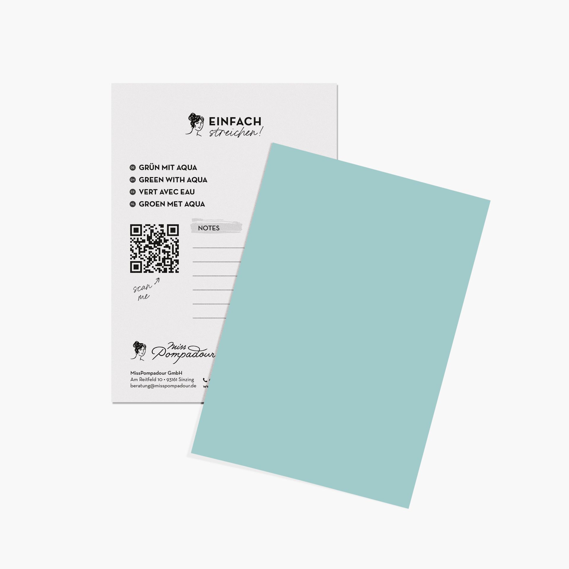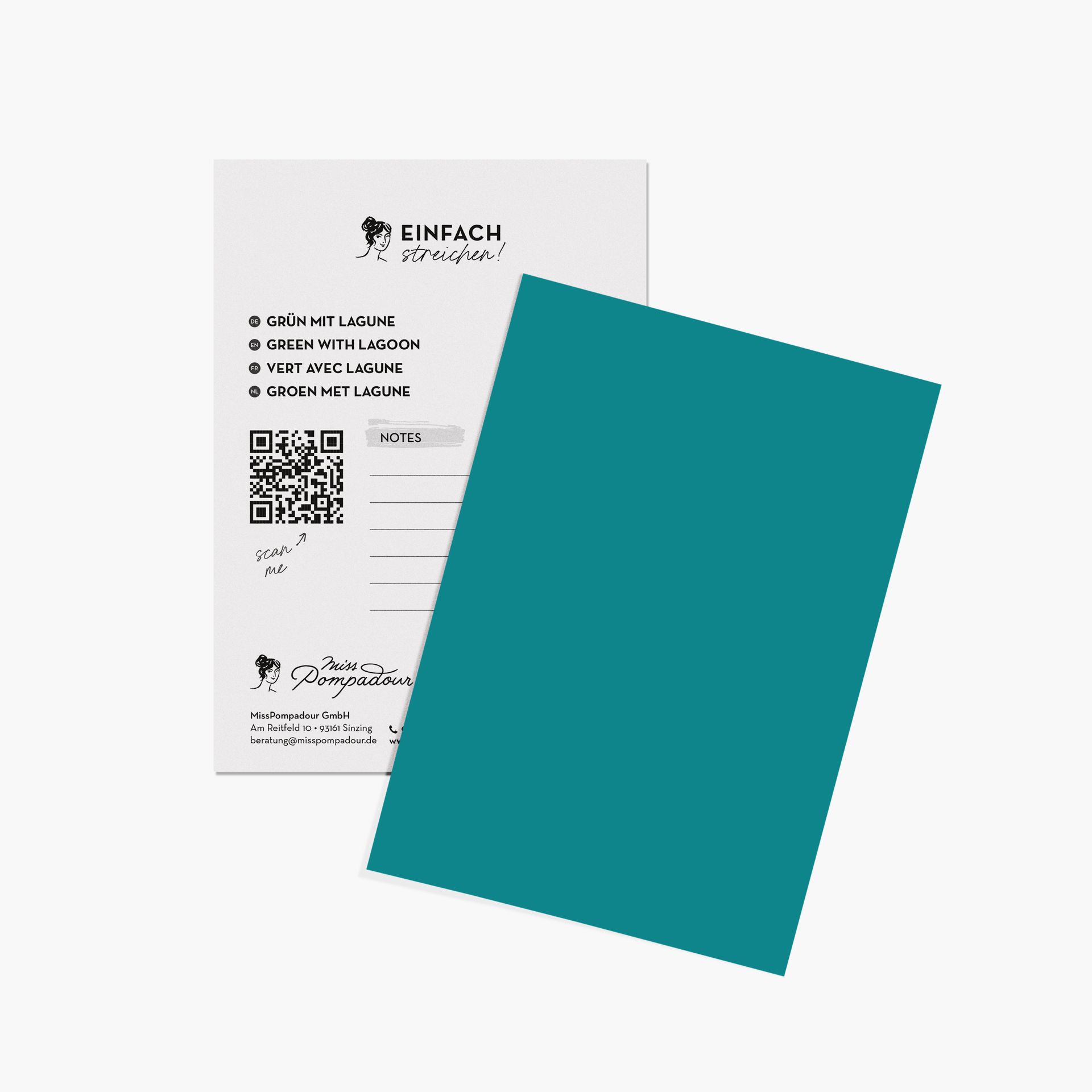 Met de grote keuze aan turquoise muurverf die MissPompadour aanbiedt, is het niet altijd even makkelijk kiezen. Daarom is het verstandig om eerst een kleurkaartenset te bestellen. Omdat deze kleursamples in ansichtkaartformaat afzonderlijk kunnen worden uitgenomen, kunnen ze bij elke belichting op de muur worden gehangen. Dit maakt het veel makkelijker om de juiste kleur te kiezen.