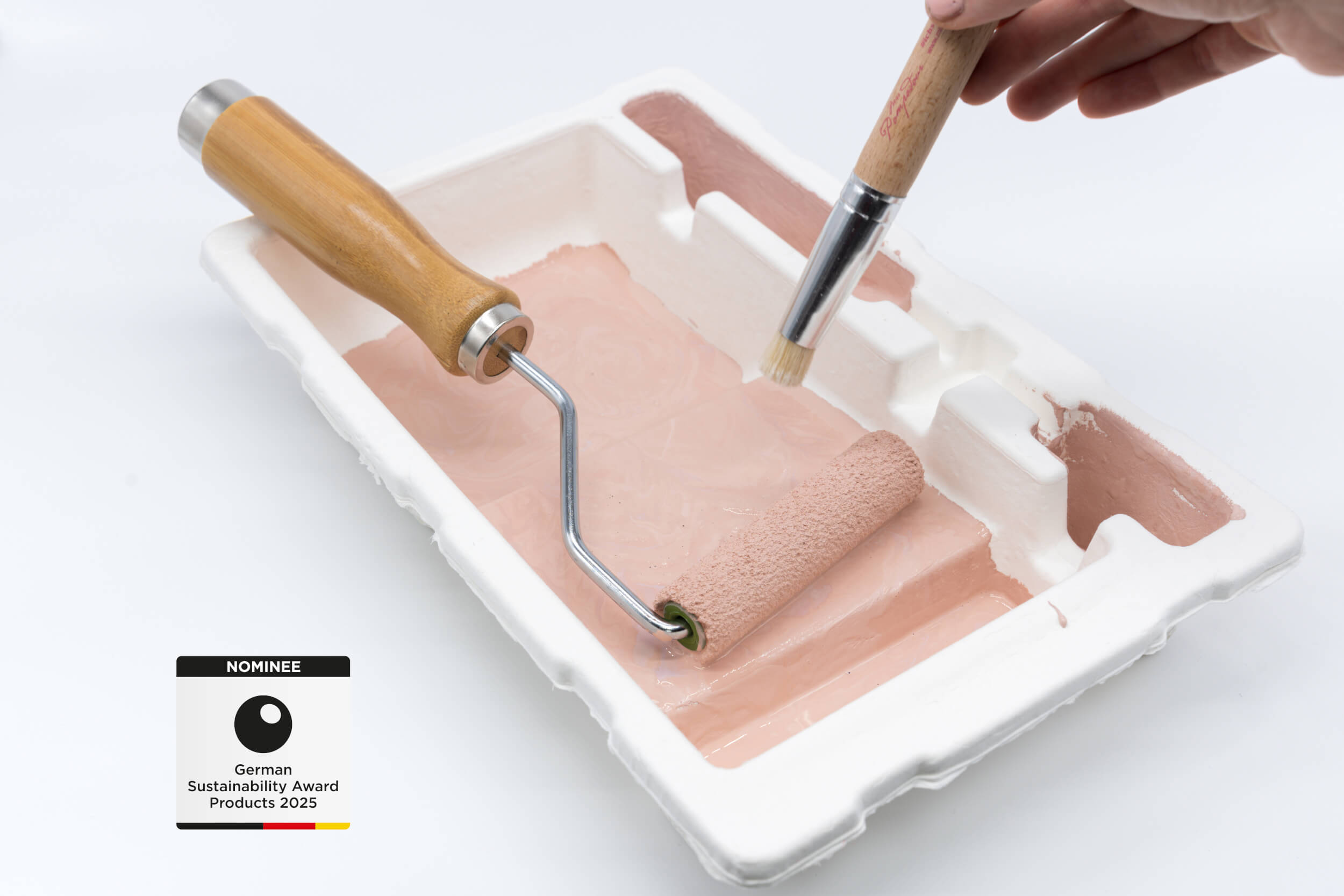 Hoe kan het ook anders bij MissPompadour! We houden gewoon niet van plastic. Daarom is ons verfbakje ook plastic-vrij. Het materiaal is cellulose, dat ook veel gebruikt wordt in de bouwmaterialenindustrie als ecologisch isolatiemateriaal. Voelt aan als dik papier of karton, maar een groot voordeel van dit materiaal is zijn stevigheid. Zelfs als het wordt blootgesteld aan vocht, behoudt Het Verfbakje z'n vorm. De dubbele coating op biologische basis is bijna onzichtbaar, maar echt sterk. Hij wordt er nog duurzamer van. En last but not least: het ingenieuze MissPompadour Het Verfbakje! is 100% composteerbaar. Ons doel is: geen plastic verfbakjes meer op de markt in 2025!